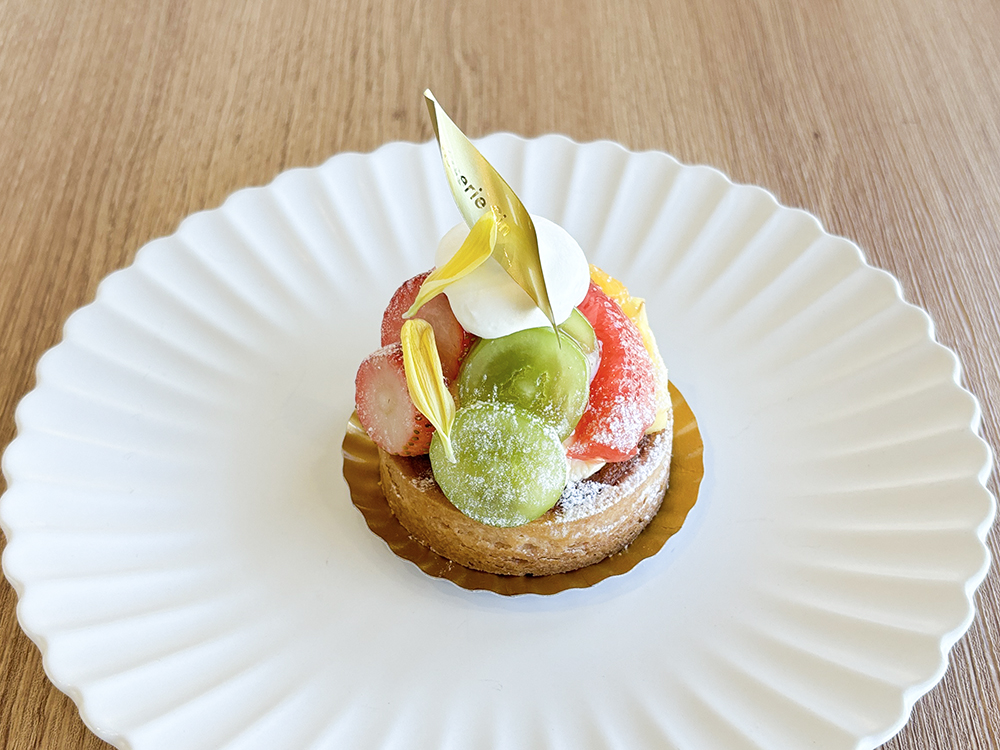 その日ごとに選んだ季節のフルーツをたっぷりのせたフルーツタルト。サクサクの生地とみずみずしい果実が織りなす、見た目も味も華やかな一品です。
