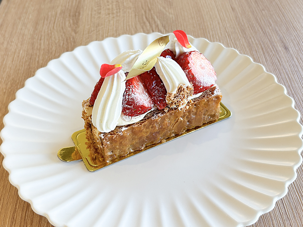 高千穂発酵バターを使った自家製パイ生地に、なめらかなカスタードと苺を重ね、素材の美味しさをシンプルに楽しめるミルフィーユに仕上げました。
